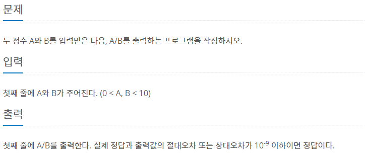 두 정수 A와 B를 입력받은 다음, A/B를 출력하는 프로그램을 작성하시오.