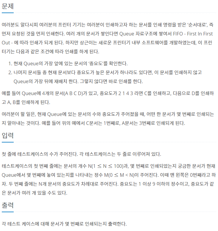우선 Test Case를 입력받아 Queue에 저장하고, 최댓값을 찾았을 때의 index가 입력받은 M과 일치하기 전까지 최댓값을 제거하고, cnt를 증가시켜주는 방식으로 풀이했다.