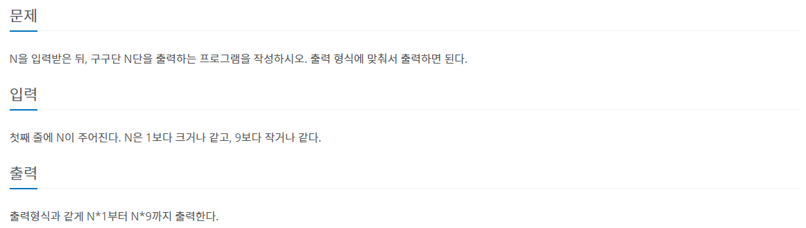 N을 입력받은 뒤, 구구단 N단을 출력하는 프로그램을 작성하시오. 출력 형식에 맞춰서 출력하면 된다.