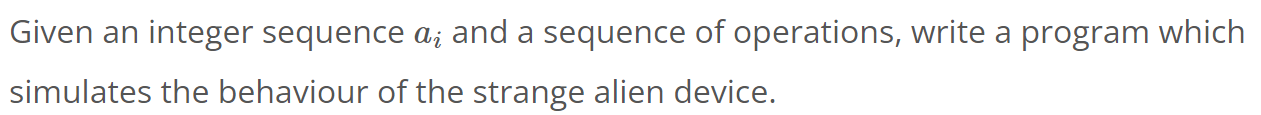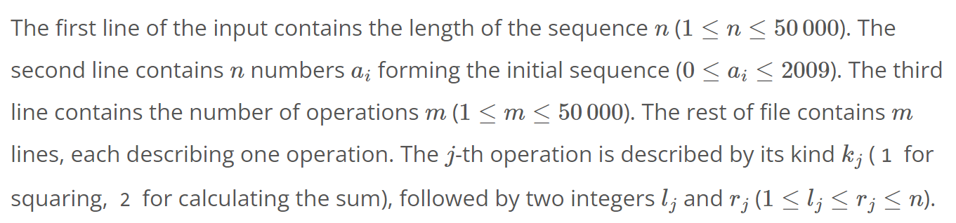 The first line of the input contains the length of the sequence $n$ ($1\le n\le 50\,000$). The second line contains $n$ numbers $a_i$ forming the initial sequence ($0\le a_i\le 2009$). The third line contains the number of operations $m$ ($1\le m\le 50\,00