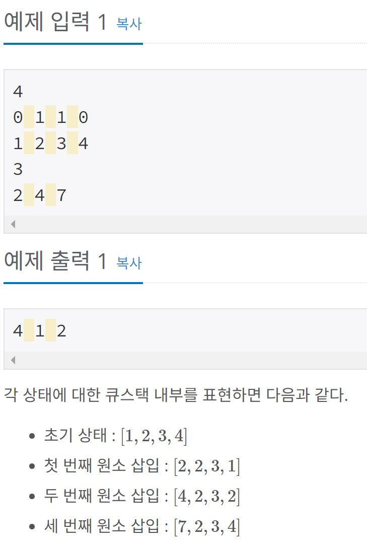 도현이는 길이 의 수열 를 가져와서 수열의 원소를 앞에서부터 차례대로 queuestack에 삽입할 것이다. 이전에 삽입한 결과는 남아 있다.