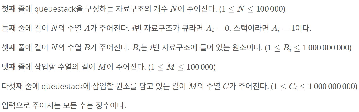 첫째 줄에 queuestack을 구성하는 자료구조의 개수 $N$이 주어진다. ($1 \leq N \leq 100\,000$) 둘째 줄에 길이 $N$의 수열 $A$가 주어진다. $i$번 자료구조가 큐라면 $A_i = 0$, 스택이라면 $A_i = 1$이다. 셋째 줄