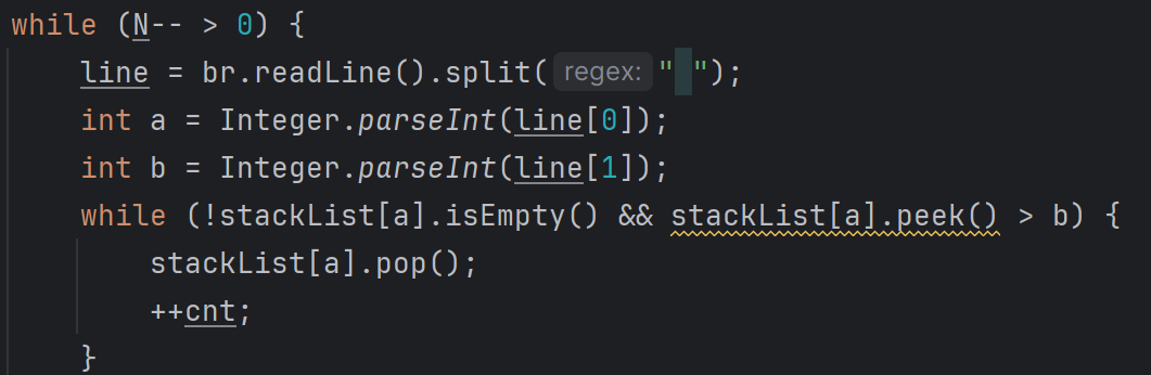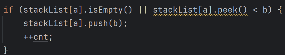 입력받은 프렛 번호(b)가 이전의 프렛보다 작은 번호인 경우 이전 프렛 번호들을 선택된 줄(a)에 맞는 Stack에서 제거하며 손가락 움직임 횟수( cnt )를 증가시켜 주면 된다.