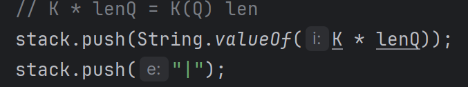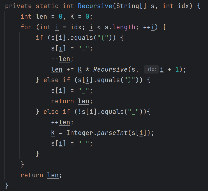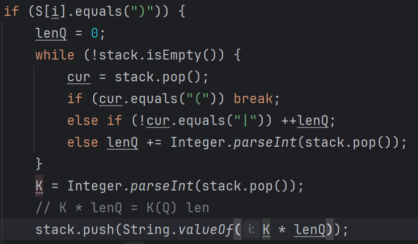 가장 안쪽의 압축 문자열에 대해 압축의 끝을 의미하는 ' ) '가 나왔다면, 다시 stack으로부터 압축의 시작인 ' ( ' 을 찾아주자. 만약 ' | ' 가 아닌 경우에만 Q의 길이를 1씩 더하고, 문제에서 주어진 압축 해제로 만들어지는 문자열의 길이 ( K * lenQ )를 stack에 다시 넣어주자.