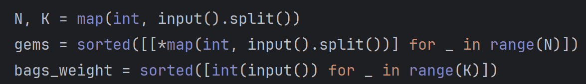 첫째 줄에 N과 K가 주어진다. (1 ≤ N, K ≤ 300,000) 다음 N개 줄에는 각 보석의 정보 Mi와 Vi가 주어진다. (0 ≤ Mi, Vi ≤ 1,000,000) 다음 K개 줄에는 가방에 담을 수 있는 최대 무게 Ci가 주어진다. (1 ≤ Ci