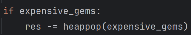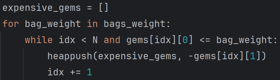 이제 가방의 용량을 초과하지 않는 보석들을 선형 탐색하며 최대 힙(expensive_gems)에 보석의 가격을 저장해주자.