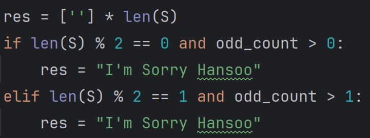 문자열의 길이가 홀수라면, 홀수개의 문자는 1개만 있어야 한다.