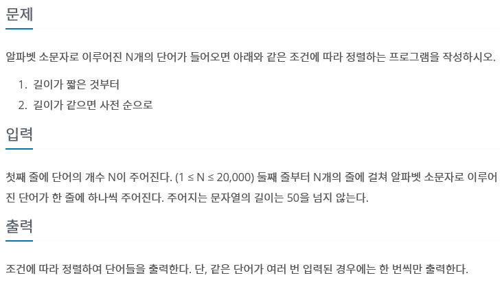 첫째 줄에 단어의 개수 N이 주어진다. (1 ≤ N ≤ 20,000) 둘째 줄부터 N개의 줄에 걸쳐 알파벳 소문자로 이루어진 단어가 한 줄에 하나씩 주어진다. 주어지는 문자열의 길이는 50을 넘지 않는다.