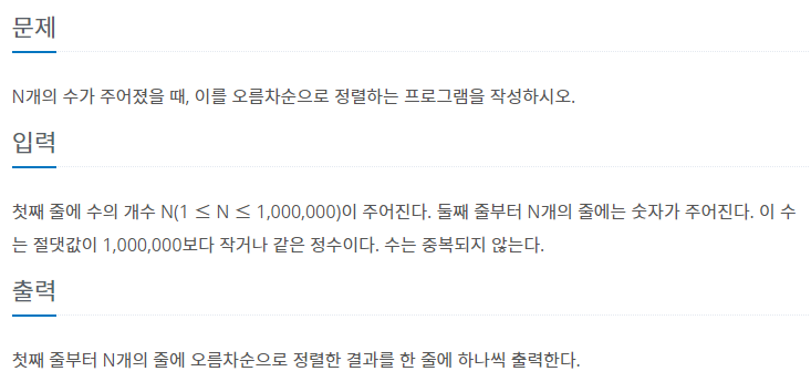 첫째 줄에 수의 개수 N(1 ≤ N ≤ 1,000,000)이 주어진다. 둘째 줄부터 N개의 줄에는 숫자가 주어진다. 이 수는 절댓값이 1,000,000보다 작거나 같은 정수이다. 수는 중복되지 않는다.