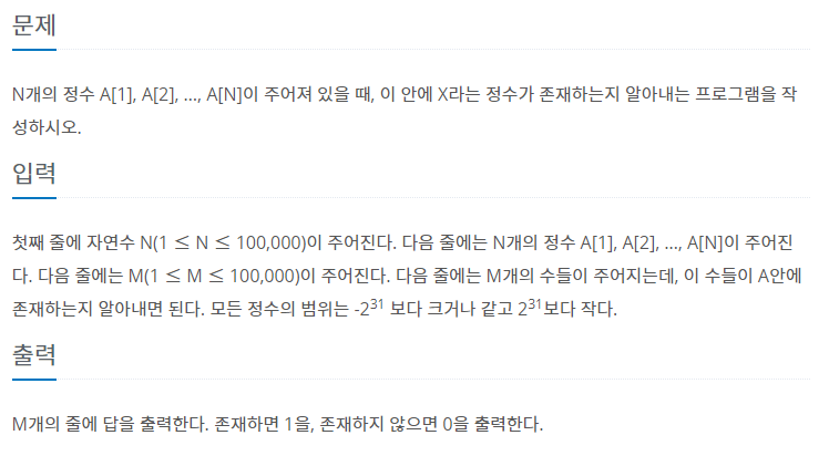 첫째 줄에 자연수 N(1 ≤ N ≤ 100,000)이 주어진다. 다음 줄에는 N개의 정수 A[1], A[2], …, A[N]이 주어진다. 다음 줄에는 M(1 ≤ M ≤ 100,000)이 주어진다. 다음 줄에는 M개의 수들이 주어지는데, 이 수들