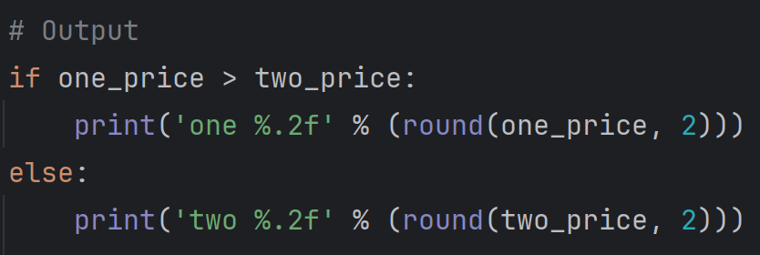 If using the single entire-purchase coupon saves Stan more money, display the word one followed by the amount of savings; otherwise display the word two following by the best savings using the two one-item coupons. All savings should be output with two digits after the decimal point.