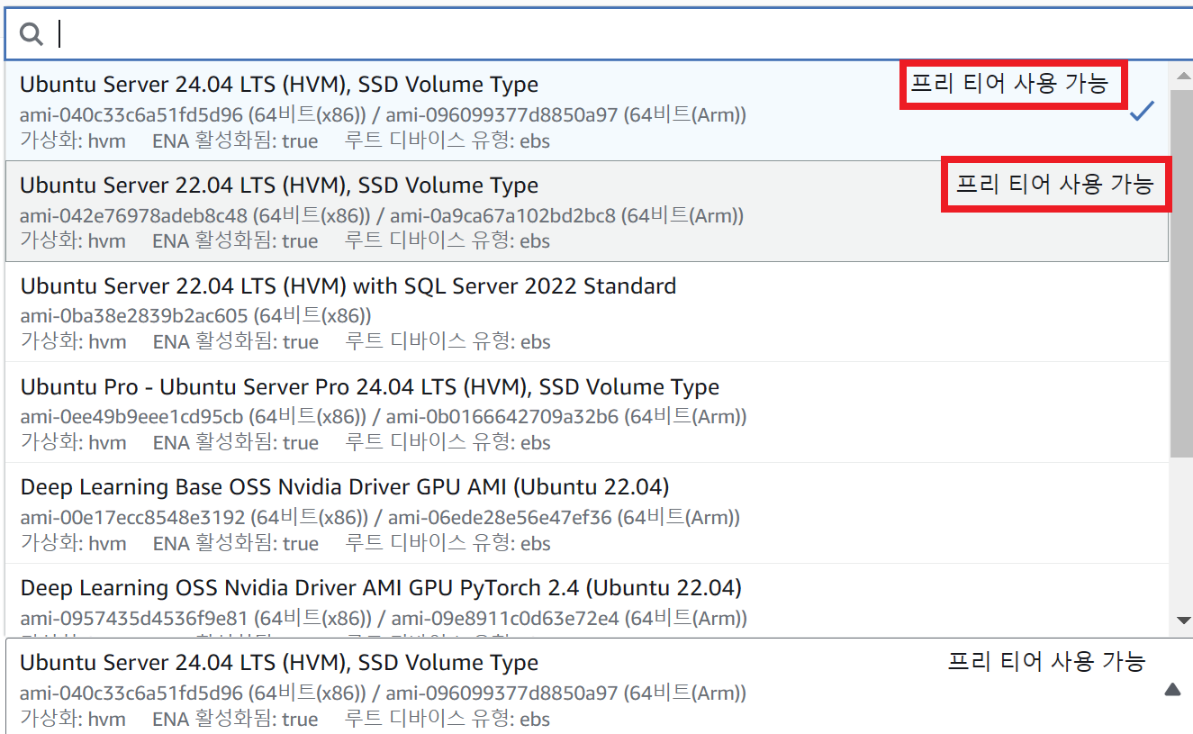더보기를 클릭해 다른 버전의 이미지를 선택할 수 있습니다. 우측에 프리 티어 사용 가능인 이미지인지 확인이 필요합니다.