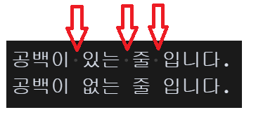 Ctrl + Shift + P → Toggle Render Whitespace 을 설정하면, 공백을 다음과 같이 표시합니다.