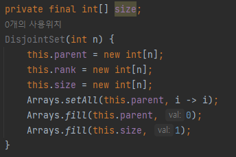 집합의 크기를 저장할 size 배열을 선언해주자.